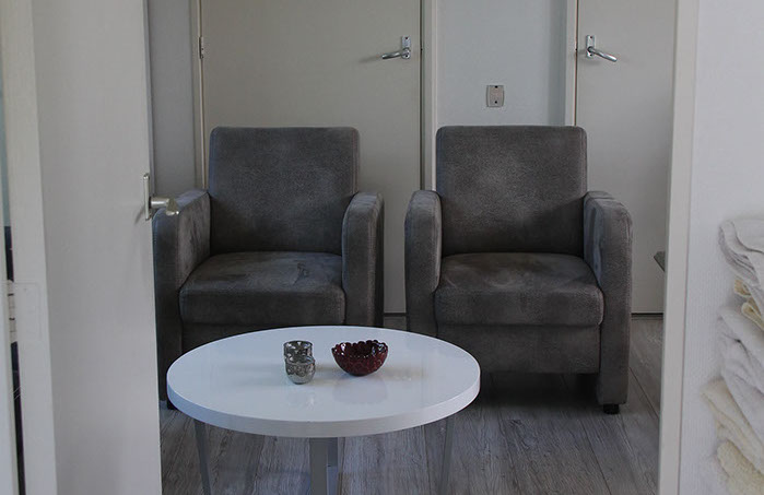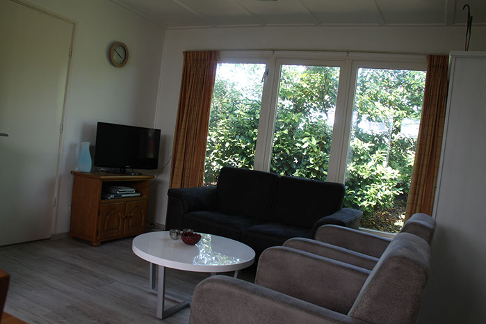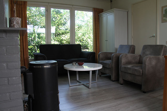 De zithoek biedt voldoende zitplaats en is voorzien van een televisie en een gezellig kacheltje. Begin 2016 is het meubilair in de woonkamer vernieuwd.