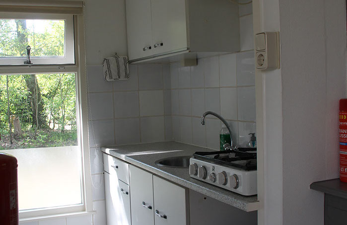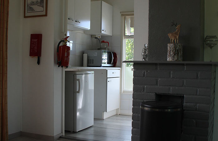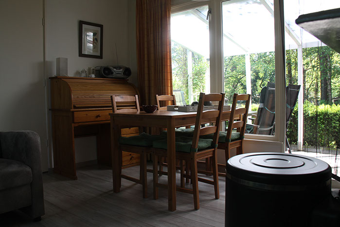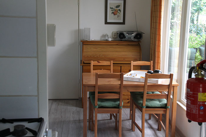De keuken is compleet ingericht met een koelkast, gasfornuis, magnetron, koffiezetapparaat en waterkoker. Er is voldoende keukengerei aanwezig, waaronder koffiekopjes, bekers, glazen, pannen en bestek. Keukentextiel, koffie, suiker en melk zijn bij de huurprijs inbegrepen. De open keuken biedt direct toegang tot de eethoek en het zitgedeelte. De eethoek bevindt zich aan de zijde van het terras waardoor u een mooi uitzicht heeft naar de tuin.
