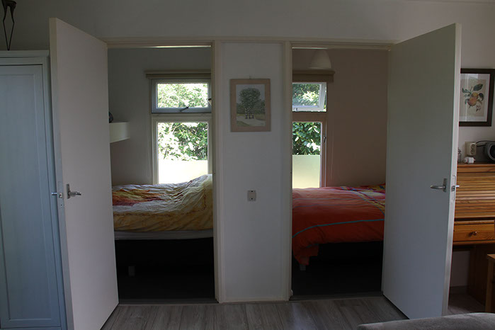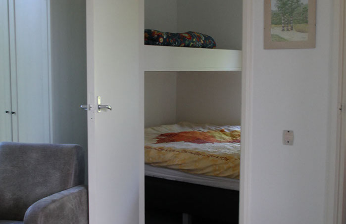 Huisje 'Berk' is geschikt voor 5 personen en heeft twee kleine slaapkamers. Slaapkamer 1 heeft een tweepersoonsbed en slaapkamer 2 een tweepersoonsbed en een éénpersoonsbed.